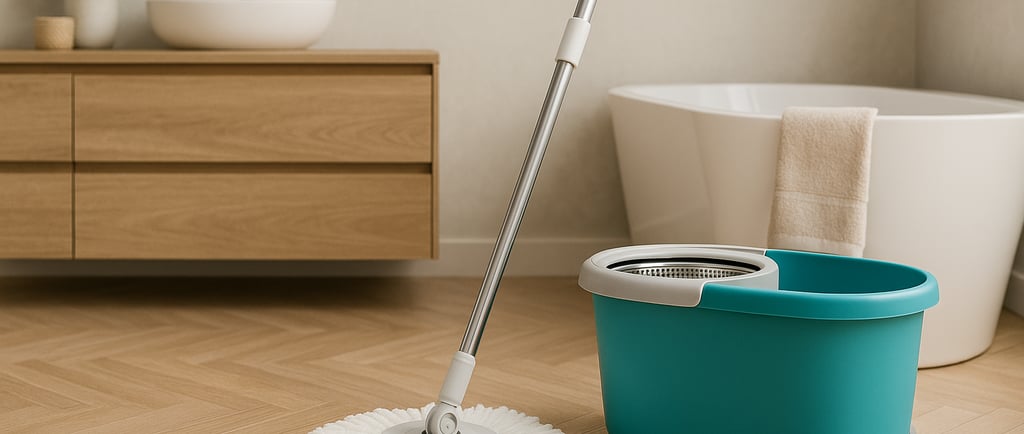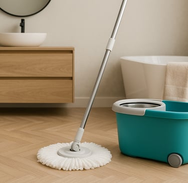 Dica prática: evite vassouras tradicionais, que levantam poeira. Prefira mops com refis laváveis e baldes com sistema centrífugo. Eles limpam com mais eficiência, poupam seu tempo e ainda protegem sua coluna. Um bom mop com rodinhas e cesto inox transforma a limpeza do chão em uma tarefa leve e eficaz.
