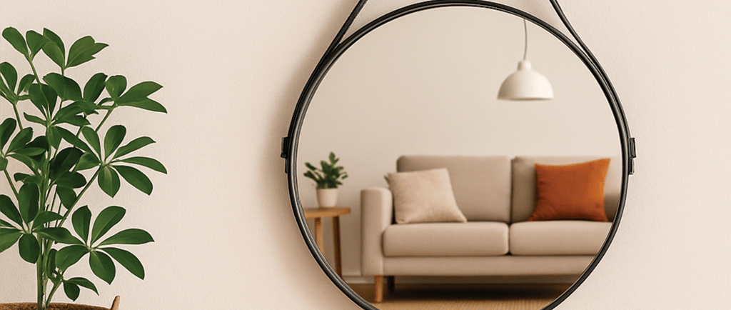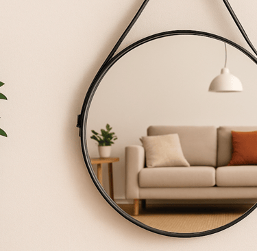Combine o espelho com elementos em madeira, vasos de cerâmica e tecidos naturais. Os tamanhos médios (40cm) são ideais.