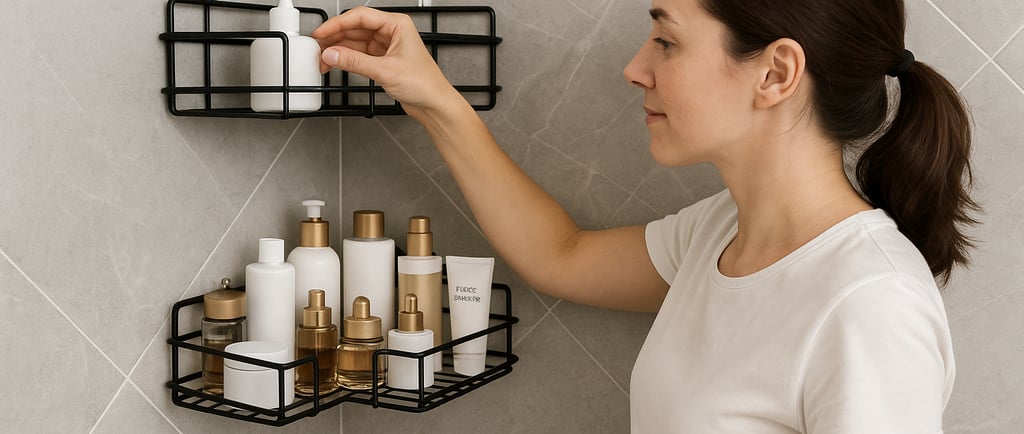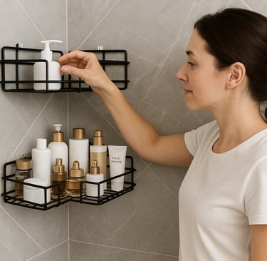 No banheiro, prateleiras adesivas são ideais para organizar shampoos, sabonetes e cremes sem a necessidade de furar azulejos. O resultado é um ambiente mais clean e funcional.